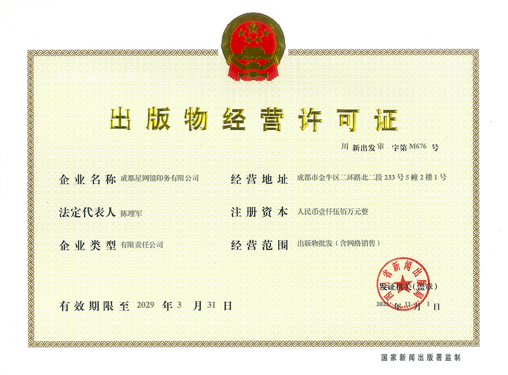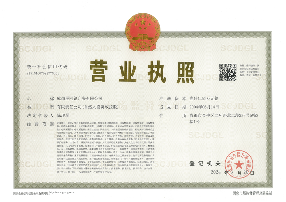 成都星网镜印务有限公司成立于 2004 年,位于成都市金牛区二环路北二段 233 号。公司始终严格遵守相关法律、法规,科学管理、诚信经营,形成了完善的“五按”管理体系;推行“清单工作法”,建立工作清单,统筹工作目标;按照“十有”工作程序管理要求,打造高效的管理团队和精干的员工队伍;建立、健全培训管理体系,加强全面培训;建立、健全全员学习管理体系,促使全员学习,建设学习型企业。